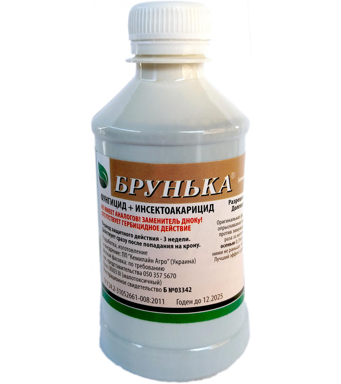 "Брунька" - універсальний препарат для обробки плодових і декоративних дерев, виноградників і ягідних кущів до початку розпускання бруньок проти зимуючих стадій збудників хвороб і шкідників.